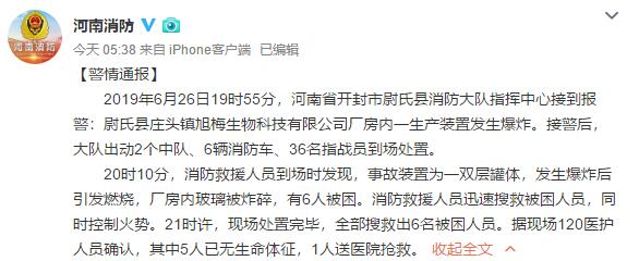 据河南省消防救援总队官方微博消息,6月26日19时55分,河南省开封市尉氏县庄头镇旭梅生物科技有限公司厂房内一生产装置发生爆炸,有6人被困。经搜救,其中5人已无生命体征,1人送医院抢救。